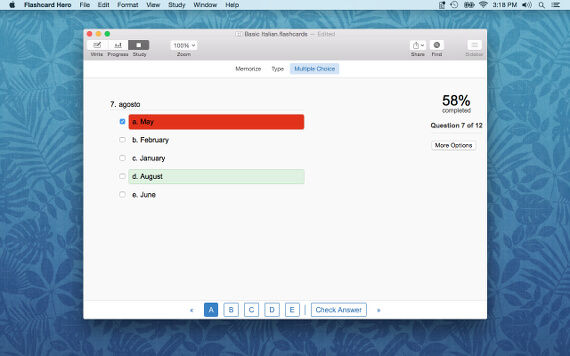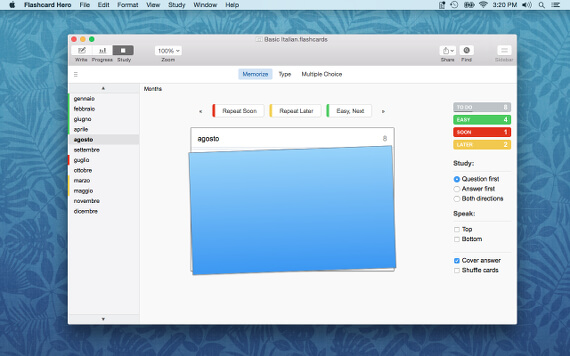 Have the answer covered, type it letter by letter, or quiz yourself with multiple choice tests. The app can also speak text on the cards in over 30 languages.