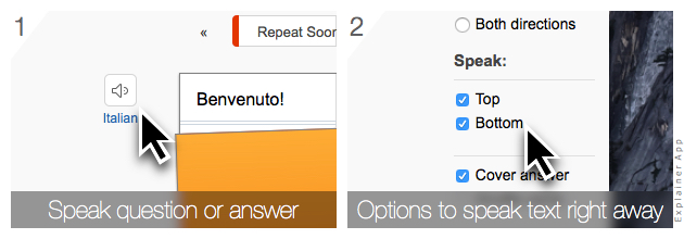The Memorize and Type study methods also offer a setting to have the question and answer spoken automatically once a card shows. You can change this in the right sidebar under the item “Speak”.